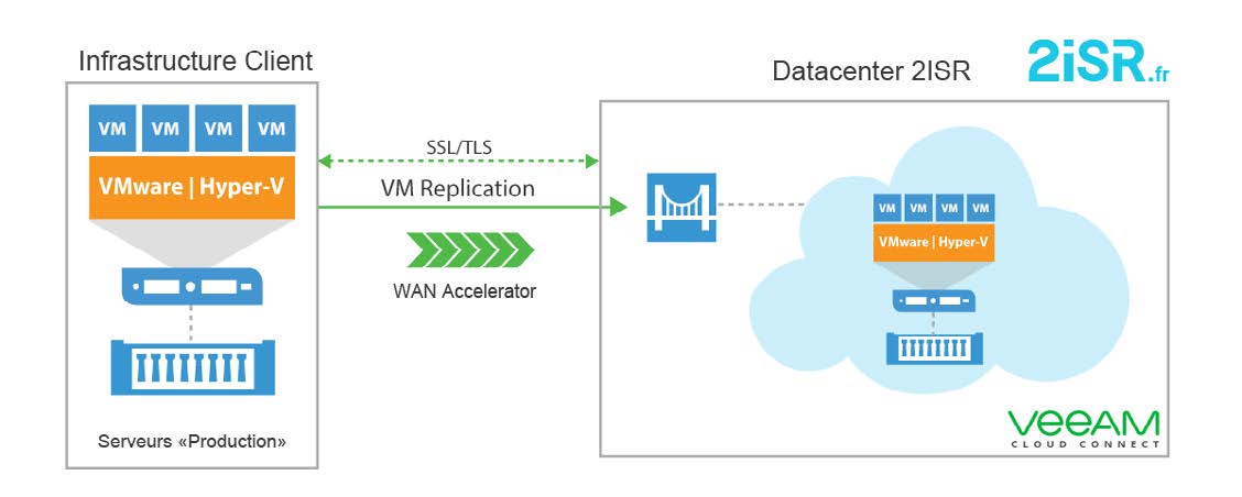 Un espace de sauvegarde de plusieurs Téraoctet (To) est créé chez 2iSR dans un Datancenter sécurisé. Vous connectez votre Veeam Backup et Réplication à votre compte Veeam C.C. Vous sauvegardez vos VMs ou vos serveurs physiques dans votre Cloud privé.